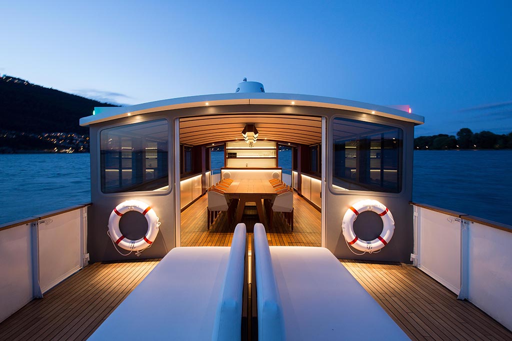 After decades of use and several home ports, the vessel returned to Lake Biel in 2009. To mark her 70th anniversary, a new era began: the transformation into the first fully electric nostalgic charter ship in Switzerland. A carefully restored classic, now powered by a Fischer Panda pod drive.